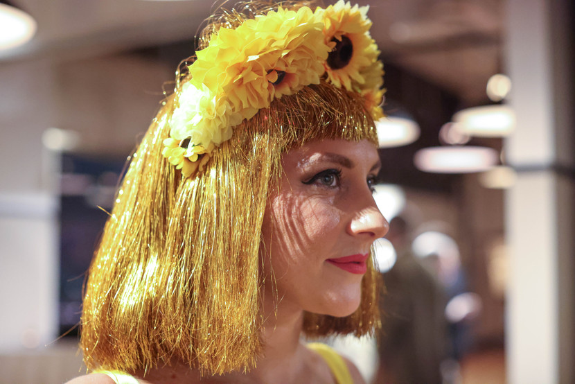 Then we went back for the reception at The Eaton. Molly created this sunflower wellness shot costume that greeted us for this performer and it was a huge hit.