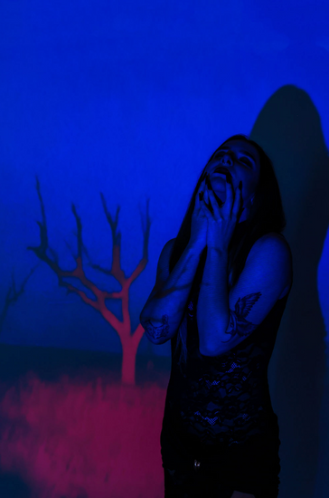 Inside the studio, the walls pulsed with moving light. A digital projector cast gothic shapes across models face, creating living nightmare. The images look like stills from a vampire film shot on 16 mm.... elegant, dangerous, and hypnotic. “Shadows” became a study of duality: who we are in light versus who we become in darkness.